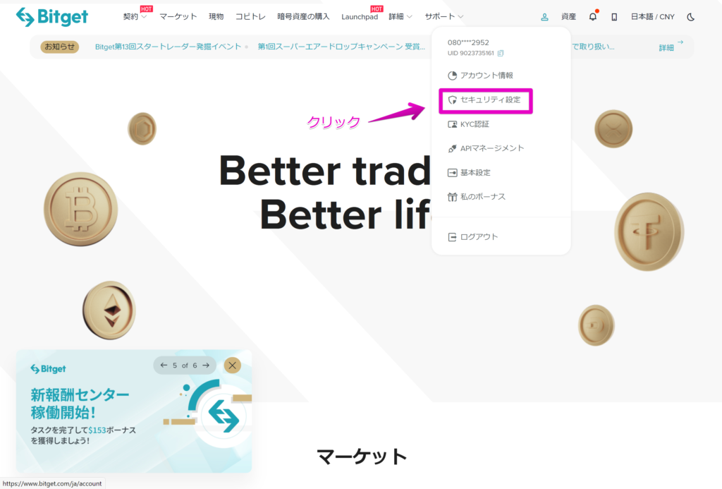 Bitgetにアクセスし、セキュリティ設定のページを開きましょう。