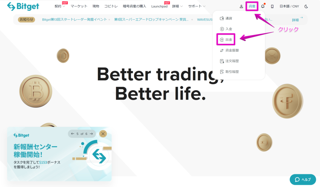 トップページにアクセスしたら「資産」から「出金」をクリックします。