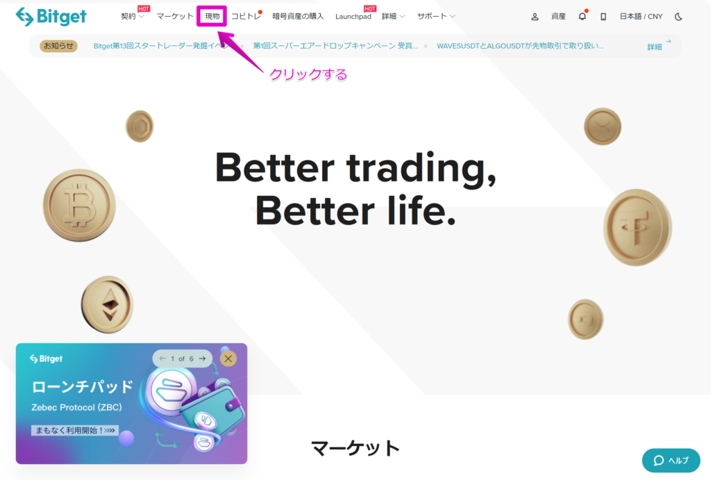 Bitgetにアクセスしたら上部メニューから「現物」をクリックします。